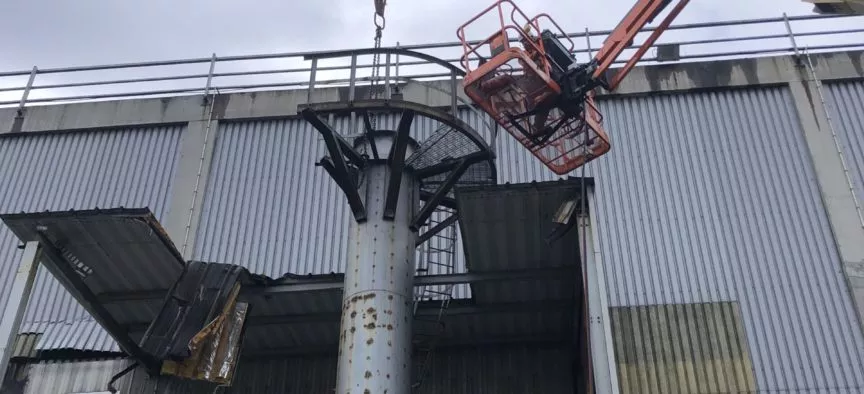 Dépose de 2 cheminées métalliques extérieures de 20m de haut par oxycoupage / levage