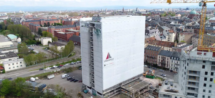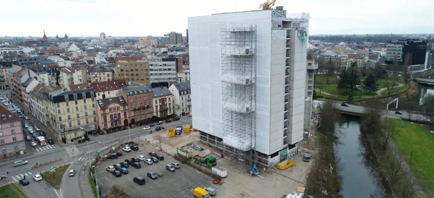 Un échafaudage périphérique au bâtiment avec confinement thermosoudé a été mis en place afin de créer une structure pour le désamiantage extérieur.