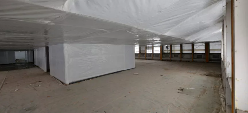 Pendant toute la durée du chantier, la co-activité était très importante : en parallèle des travaux de curage et désamiantage, les travaux de gros-œuvre avaient lieu dans les étages supérieurs désamiantés. Notre accès aux zones amiante se faisait donc par des sapines extérieures afin de permettre notre intervention de manière indépendante.