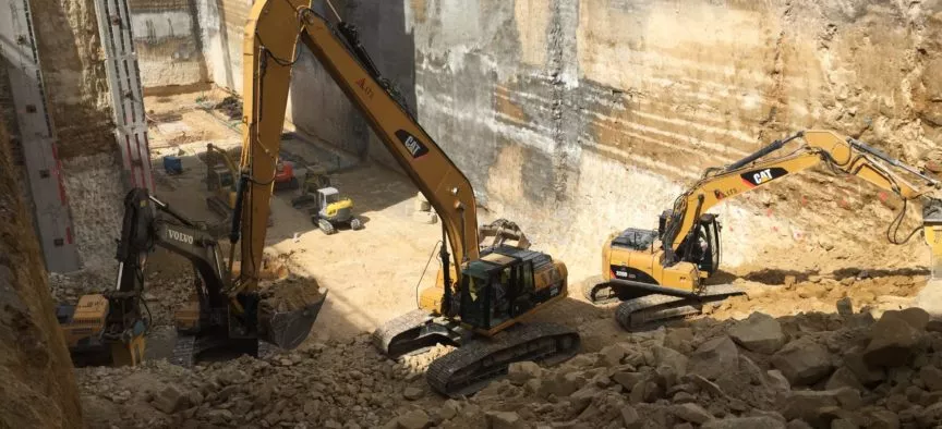 Démolition de plusieurs immeubles R+8 en plein centre de Luxembourg, puis terrassement à –35 m pour la création de 8 niveaux de sous-sol, et tout cela dans la roche.