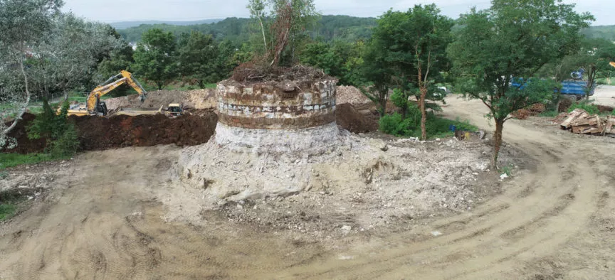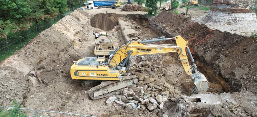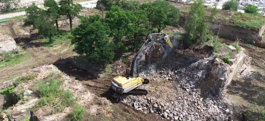 Pour venir à bout des massifs en bétons armés de l’ancien site SACILOR, 4 à 5 pelles de 50 à 100 tonnes équipées de BRH de 4 à 8 tonnes ont été nécessaires, afin de réaliser l’opération en moins de 6 mois.