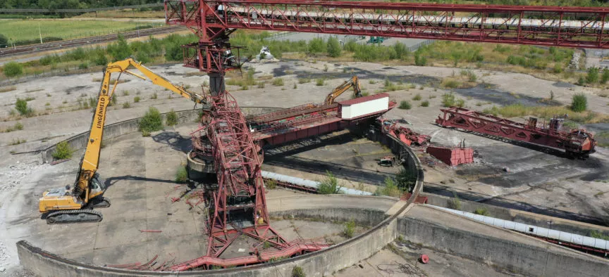 Après avoir établi le plan de prévention et les nombreux modes opératoires de démantèlements et levages, il aura fallu pas moins de 6 mois pour arriver à bout des 3 200 tonnes de ferraille qui constituaient l’ensemble des 2 km de convoyeurs à charbon.