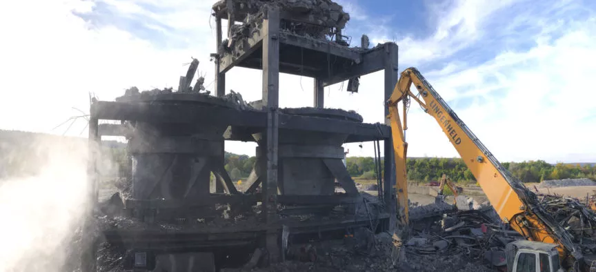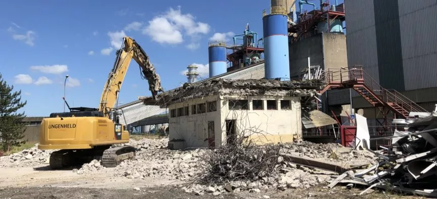 Après avoir échangé les couteaux de la cisaille ferraille pour la mâchoire béton, notre pelle toujours équipée de son grand bras aura également démoli les 11 000 tonnes de béton des silos qui stockaient le combustible juste avant sa pulvérisation dans les chaudières.