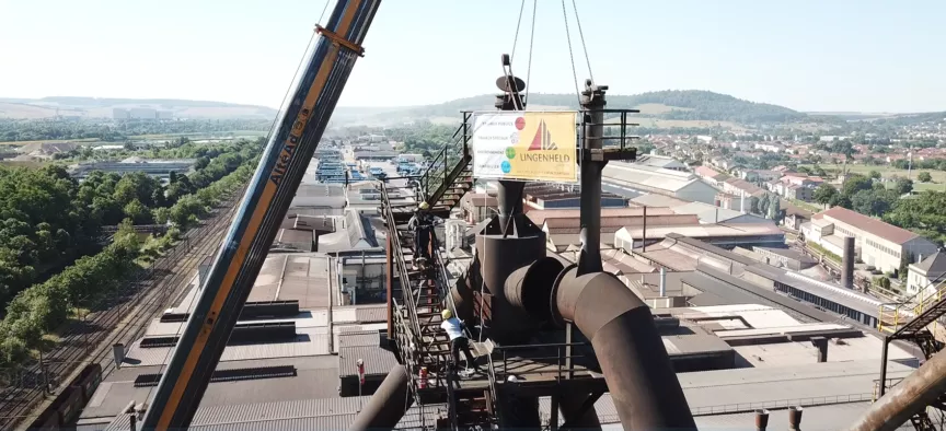 Démantèlement de la partie supérieure du haut fourneau n°1 de l’usine Saint Gobain de Pont à Mousson. L’ouvrage construit au début du 20ème siècle, et arrêté depuis 20 ans, devenait trop vétuste au sein d’une usine toujours en activité.