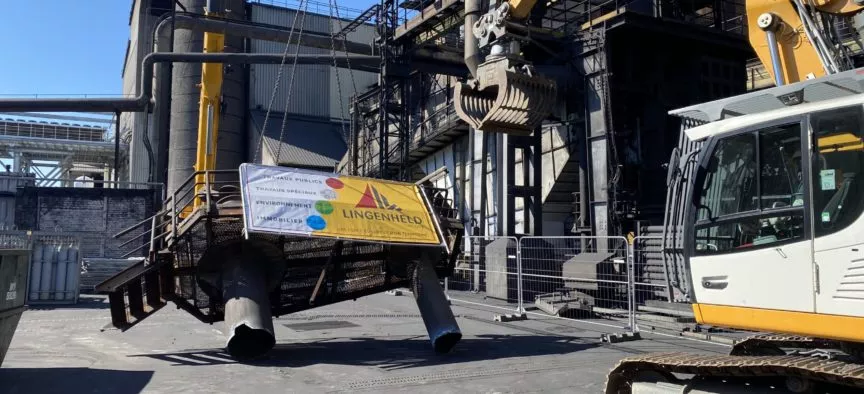 Démantèlement de l’ouvrage de 55 m à 35 m de hauteur ainsi que d’un tube de 30 m de longueur et d’une boite à poussière uniquement par grutage/levage. Avec une gestion des colis au sol dans une emprise très réduite.