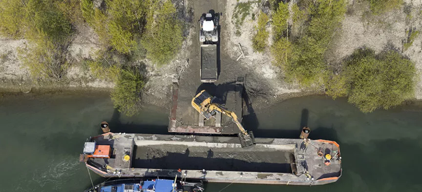 Dans le cadre de sa mission d’entretien du réseau, VNF doit engager des opérations de dragage afin de garantir le mouillage dans le chenal de navigation ainsi que l’accès aux garages amont et aval des écluses de Gambsheim.