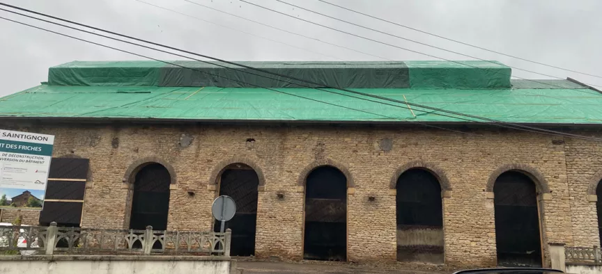 Désamiantage et déplombage du site, démolition des cloisons non-porteuses et du dallage intérieur. Dépose soignée de la toiture pour réutilisation et bâchage de cette dernière.