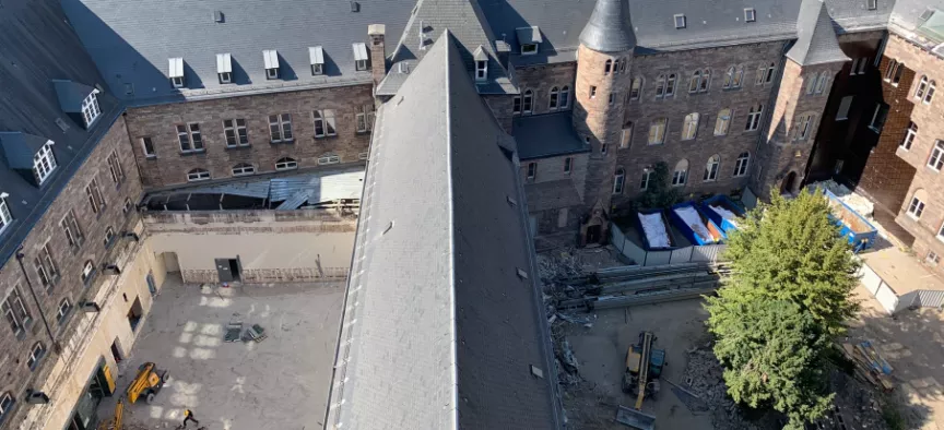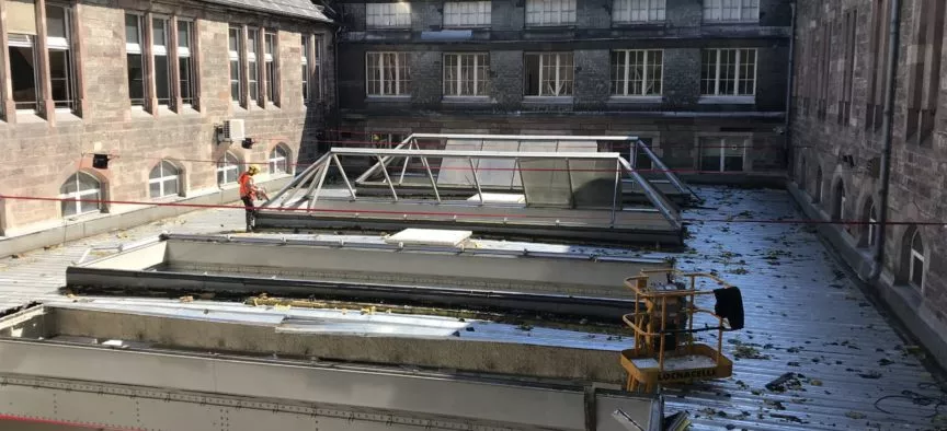 • Démontage des charpentes métalliques pièce par pièce : les plus gros éléments ont fait l’objet d’un levage à l’aide d’une grue de 150 T, passant au-dessus des toitures conservées, et amenées au sol dans la grande cour afin de pouvoir les débiter pour leur évacuation,
