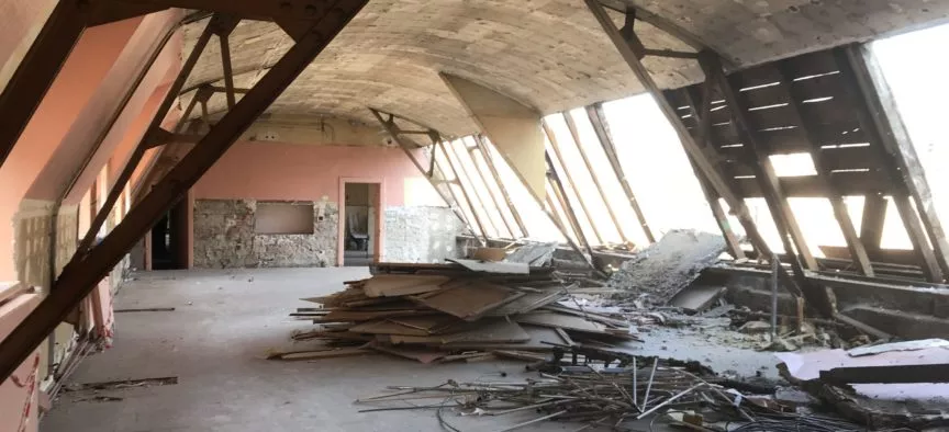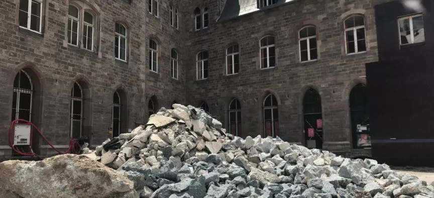 Les travaux de curage ont permis de vider le bâtiment des cloisons lourdes et légères, des planchers en bois, de tuyauteries et appareillages, mais aussi des déchets divers abandonnés sur site. Les scories présents dans les planchers bois des combles ont été retirés à l’aide d’une aspiratrice tri-turbines, nécessitant la mise en œuvre partielle de près de 80 mètres de rallonge d’aspiration pour atteindre les endroits les plus reculés. Le désamiantage s’est déroulé pendant 6 mois, repartis en une trentaine de zones de traitement différentes. Ce chantier reste une référence dans le recyclage, et surtout dans le réemploi des matériaux sur un chantier de déconstruction.