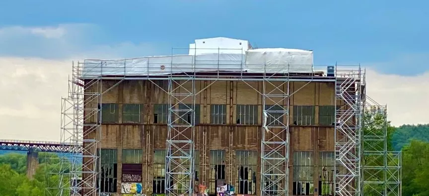 Après une phase de désamiantage, débute la phase importante de la démolition de la toiture des anciens silos à minerais, pour laquelle auront été nécessaire 10 mois d’échanges et de négociations avec les administrations luxembourgeoises afin de mettre en place un dispositif innovant encore jamais réalisé au Luxembourg.