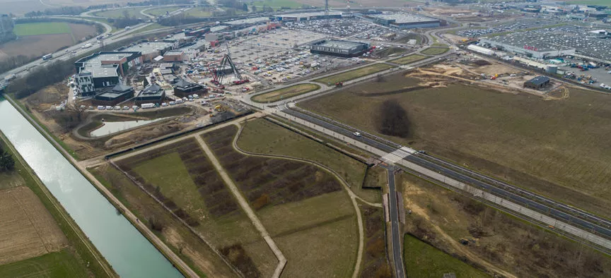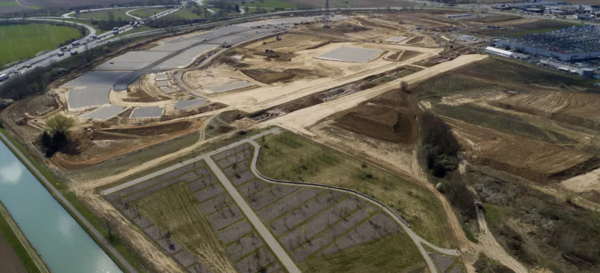 - Terrassement en déblais-remblais des surfaces commerciales avec traitement au liant avec un mouvement de terres de 180 000 m3,
